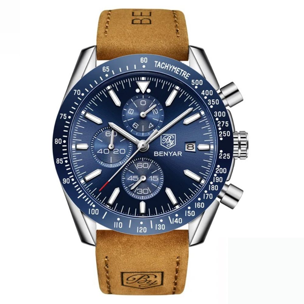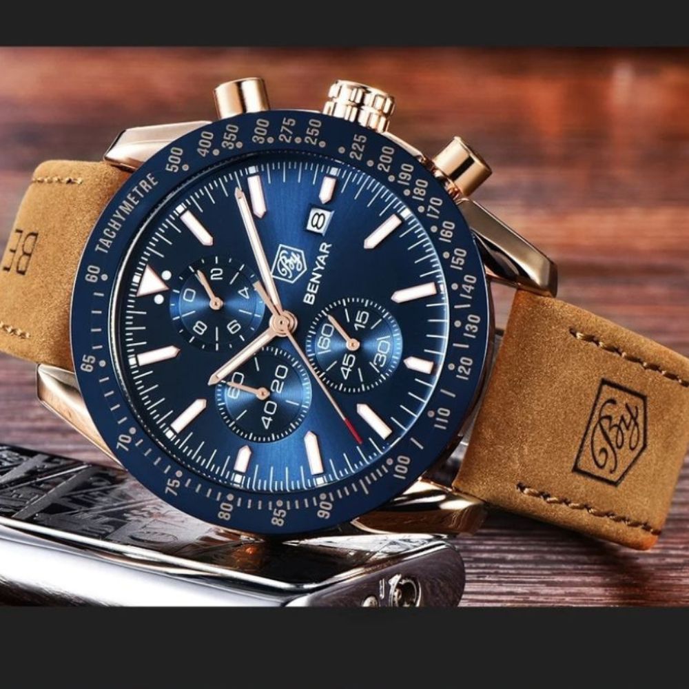 A pulseira do Benyar Thalasso é finamente feita em couro, unindo durabilidade excepcional à leveza sofisticada do material. O resultado é um encaixe confortável e discreto, que oferece a sensação quase imperceptível de estar usando um relógio de alto padrão.